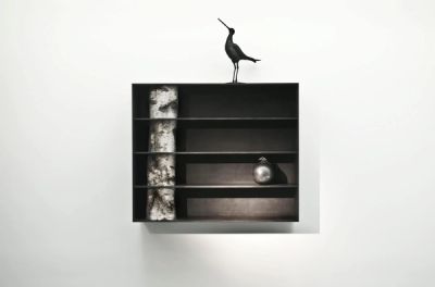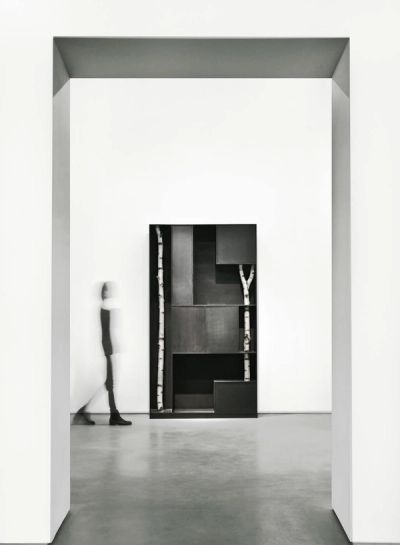 « Trees » represents a continuation of his thinking on architecture. He creates a minimalist space of shelves, veritable pieces of micro-architecture made from aluminium that spread out in neo-plastic bursts like a Mondrian. However, through the splits in the frame, Andrea Branzi introduces trunks and twigs gathered in the wild. This strange encounter that began in the eighties with « Animali domestici », questions the duality of the nature-culture relationship.