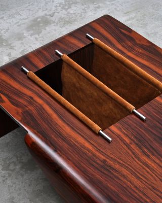 The exhibited works include Joaquim Tenreiro’s Coffee Table (1950), made using Vinhático, a native Brazilian wood, a tribute to Latin America's local wood and craftsmanship. Lina Bo Bardi's Writing Desk (1950) exemplifies her pioneering contribution to Brazilian modernism, breaking gender barriers for women in a time and field mostly reserved for men. Jorge Zalszupin's Lounge Set, Topolino, is a fusion of European influences with the local aesthetic, showcasing a new modern language unique to Brazil.