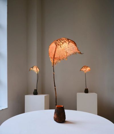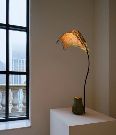 Meticulously hand-crafted in the designers’ Paris workshop, the Ishigaki Lamps combine the natural elegance of bamboo with the harshness of metal and the fragile poetry of fabric. The lighting sculptures comprise a metal and carbon base supporting a bamboo stem with a delicate linen lampshade. Each is crafted in a different colour, from amber and red coral to green rust and moss copper, while each unique bamboo stem also has its own particularity, adding a touch of individuality to every piece.