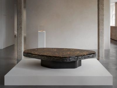 Central to the presentation are new editions of the Resina Botanica tables whose irregular shapes were informed by natural boulders found in the riverbed of the Solinka River in the Bieszczady Mountains Natural Park in Southern Poland. Embraced in patinated cast bronze bases, their tabletops highlight unique floral compositions cast in dark green and rust-hued resin, alluding to whirlpools of water and the leaves, lichens and weeds flickering just beneath the surface of the lively mountain river.