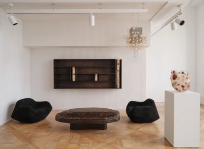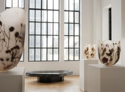 The exhibition is expanded to include a new body of work that has its worldwide premiere in Carpenters Workshop Gallery New York. Resina Botanica, a new iteration of the studio’s Flagship Flora series, acts as a portal into the immense influence nature has on Marcin’s creations. The shapes of the cast bronze tables were inspired by stone slabs found in the riverbed of the Solina River in Southern Poland. Juxtaposed with unique floral compositions cast in dark green and rust-hued resin, the visual appeal of the pieces resembles whirlpools of water that invite the viewer to delve deep into the alchemy of materials, the elaborateness of the creative process and the natural phenomena that inform them.