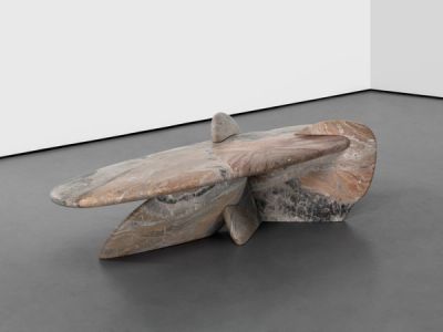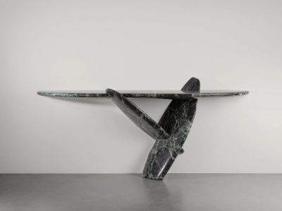 The exhibition begins on the ground floor of the gallery with the Fuse series, including a previously unseen console in a striking Alpi Green marble. As with much of Trevelyan’s recent work, Fuse stems from a desire to broaden the scope of his practice by setting aside a brief-led design approach to draw inspiration from structured experimentation in both material and process such that uncertainty and unfamiliarity become integral to the creation of the work. Derived initially from a thought experiment involving the fusion of simple forms to create structure, the evolution of this series was informed by both wooden puzzles from childhood and the construction of simple maquettes in which pins were used to temporarily assemble larger structures. Translating the concept from maquette to large sculptural pieces in marble and bog oak required a meticulous design process involving precise sculpting of curved geometries to enable the forms to slot together and lock. As such, the aesthetic simplicity belies a technical complexity and the series exemplifies a blend of sculptural elegance with structural precision.