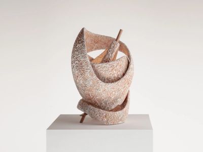 The exhibition continues on the first level of the gallery with works from the Gyre series that meld digital fabrication with meticulous hand-sculpting and finishing. Trevelyan has previously worked largely in bronze – in contrast Gyre features works that are characterised by a spontaneous painterly approach to the expression of both form and colour in the finished works. Elegantly looped structures of 3D printed sand and resin undergo a process in which thickened pigmented epoxy is built up in multiple layers over many days to build a surface patina in which colour and texture are interlinked. Cutting back the final surface reveals a stratigraphy of hues from palettes unique to each work that are drawn from personal experience. The accompanying maquettes are selected from various stages of the process, illustrating the exploration of form, texture and colour that informs the development of the works.