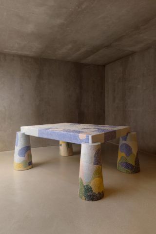 A dining table titled 3 Carrer del Bau is made of colourful mosaic tiles, with different landscapes depicted within the surfaces of the work. The scene found in the top of the table is inspired by the artist’s experiences in the countryside of southern France near the Spanish border, with different scenes portrayed. These memories act as souvenirs of states of happiness, offering an escape into a childlike past.