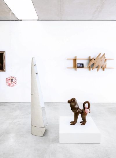 Strategically displayed in the exhibition space, the result is a cross-historical “community of objects” that creates a network of meanings. The exhibition is divided into five themes: (1) Artificial Intelligence, (2) the Morphing of the Natural into the Artificial, (3) Forms of Randomness/Control and Fragmentation, (4) Instability and Fetishism and (5) Informed Objects. Generated by the body of work itself, these themes not only structure the amplified presentation of the designer’s own work, but also provide new perspectives on all the works presented. Rather than drawing a conclusion, they mark a starting point for an investigation of our times. In response to the five themes, a five-part installation without walls or corridors unfolds in front of an oversized back-lit screen. A specific surface that connects the “community of objects” exhibited to the digital world.