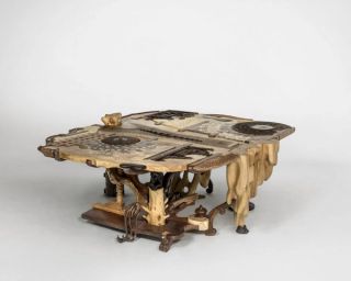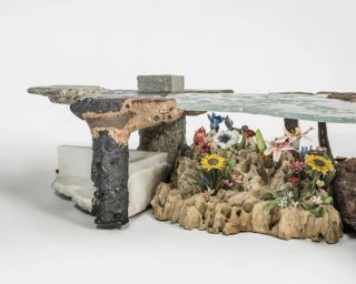 Athens-based artist and designer Kostas Lambridis presents a selection of nine new sculptural pieces in an engaging exhibition at Carpenters Workshop Gallery, New York. A master of the mash-up, Lambridis has woven in elements of art history – from Baroque to Arts and Crafts, as well as materials – from metal to stained glass into his often large-scale sculptural furniture. In this new series, he continues his mastery of fusing different elements to create a whole, but here he focuses on one material at a time: wood, metal, mineral, and plastic.