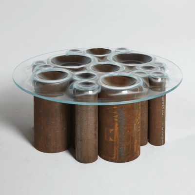 carpenters workshop gallery presents a new body of work by paul cocksedge, coinciding with the london design festival 2020. titled ‘SLUMP’, the collection comprises eight tables, whose glass surfaces have been ‘slumped’ over industrial and natural materials including concrete, steel, wood, and rock. each one-of-a-kind piece is the result of collaboration with dozens of skilled craftspeople in the UK, utilizing specialized techniques and machines.