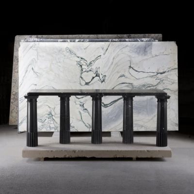 Designer, photographer, illustrator and now… sculptor? Karl Lagerfeld has turned his multi-talented hand to sculpture work for his new exhibition, Architectures, to be held at the Carpenters Workshop Gallery in Paris this fall. The designer has created a collection of functional art, modeled on the aesthetics of antiquity – a period which he particularly admires. Each sculpture from the collection is made of rare Arabescato Fantastico marble, which gives every lamp, table, fountain and mirror a deep, gray-veined appearance. Behind these sculptures is the architect Aline Asmar. Each piece was sculpted, faceted and polished in Italy by local artisans. The result? A delicate balance of timeless aesthetics which plays on classic and modern features.