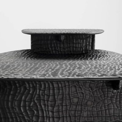 In their minimalist Tiss-Tiss series, the Japanese-French design duo Aki+Arnaud succinctly combine the harshness of metal with the fragile poetry of fabric. Aluminium components are sand-cast in a relief of linen fabric, with a usually loose weave fixed in rigid formations. Such is the level of detail achieved by their expert casting process that the metal exhibits an illusory trompe-l’oeil effect. The distinctive patina was not conceived purely as a technical challenge, but also as a means of capturing a moment in time. Influenced by the Buddhist philosophy of Impermanence, Aki+Arnaud transform fluid fabric into metal, as a means of preservation.