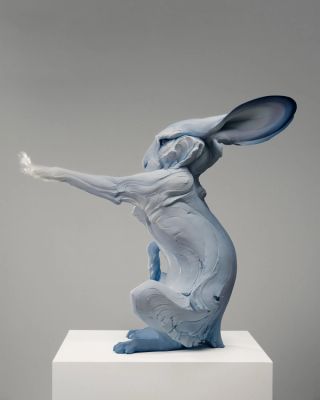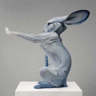 Captive depicts a life-sized equine figure poised on a burned and blackened plinth, her body curving in tandem with the tiger, designed in collaboration with J.A.W. Cooper, tattooed onto her flesh and, perhaps, her mind, holding her within its predatory embrace. This piece reflects on the complex patterns of behaviour that form around reactions to fear and pain, and ultimately merge with our sense of self, oftentimes irrevocably.